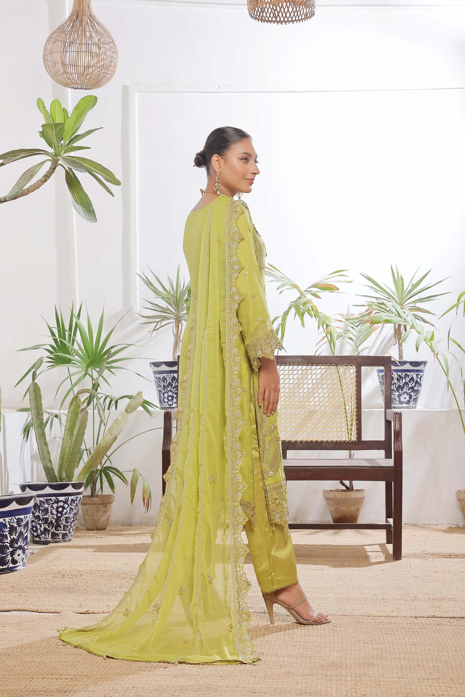 Bright lemon chiffon shirt adorned with intricate embroidery, a flowing chiffon dupatta and dyed crepe trouser. Radiant and festive.