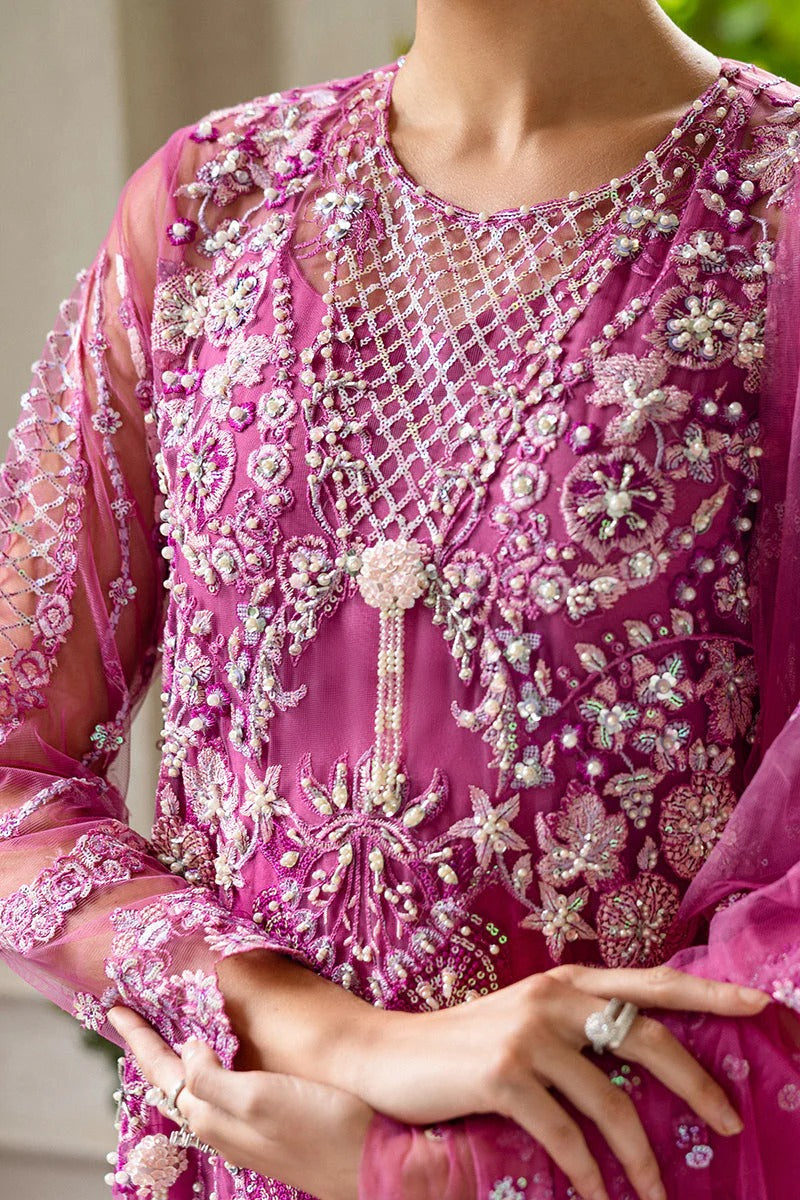 • Embroidered, sequined & hand embellished front yoke (net) • Embroidered, sequined front & back (net) • Embroidered, sequined sleeves (net) • Embroidered, sequined pearl embellished front & back daman border (organza) • Embroidered, sequined finishing lace (organza) • Hand made tassels for neckline
