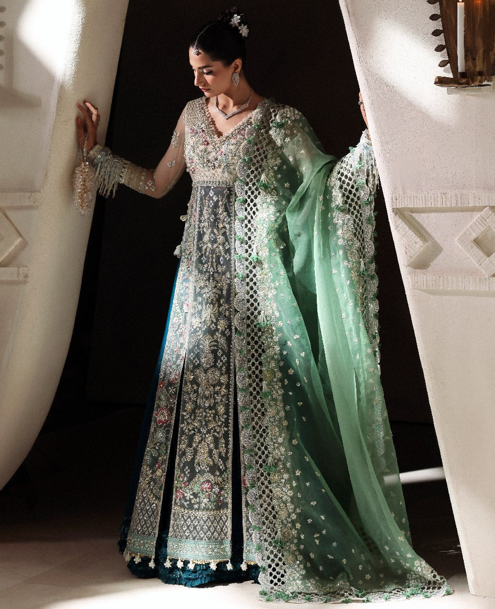 Front Bodice Embellished (Net) 1-PC Front Center Panel Embellished (Net) 1-PC Front Left Panel Embellished (Net) 1-PC Front Right Panel Embellished (Net) 1-PC Sleeves Embellished (Net) 22" Sleeves Border Embellished (Satin) 1-PC Back Bodice Embroidered (Net) 1-PC Back Panels Embroidered (Net) 3-PC Back Motif Embroidered 1-PC Belt Patti Embroidered (Organza) 1-PC Front +Back Hem Border Embroidered (Satin) 2-MTR Sleeves Border Embroidered (Organza) 1-PC Dupatta Embroidered (Organza) 1-PC Dupatta Border Embroidered (Organza) 8-MTR Dupatta Pallu Embroidered (Organza) 2-PC Slip (Raw Silk) 1.5 MTR Trousers (Raw Silk) 4 MTR