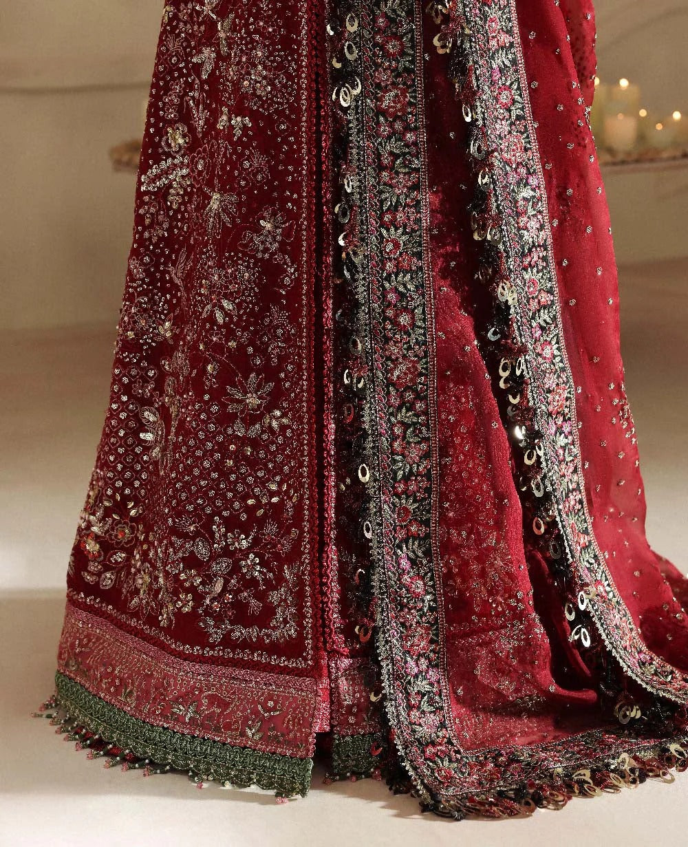 Front Bodice Left+Right Embellished (Raw silk) 1-PC Front Left Panel1 Embellished (Organza) 1-PC Front Right Panel1 Embellished (Organza) 1-PC Front Left Panel2 Embellished (Organza) 1-PC Front Right Panel2 Embellished (Organza) 1-PC Sleeves Embellished (Raw Silk) 22" Back Bodice Embroidered (Raw Silk) 1-PC Belt Patti Embroidered (Organza) 1-PC Back Panels Embroidered (Organza) 4-PC Front+Back Hem 1 Embroidered (Organza) 1-PC Front+Back Hem 2 Embroidered (Organza) 1-PC Sleeves Border1 Embroidered (Organza) 1-PC Sleeves Border2 Embroidered (Organza) 1-PC Dupatta Embroidered (Organza) 1-PC Dupatta Border Embroidered (Satin) 8-MTR Trousers (Raw Silk) 4-MTR