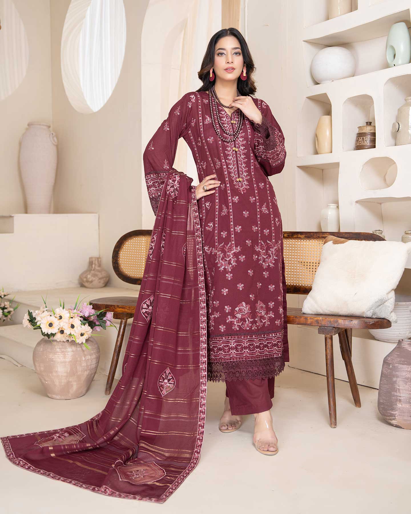 Premium Embroidered Lawn Stripe Shirt Luxury Embroidered Applic WorK Lace Dupatta Comfort Of Plain Trouser